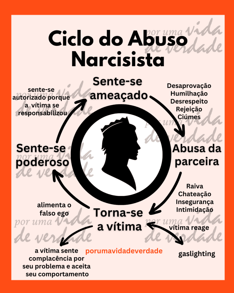 Quando o abusador é narcisista, o final do ciclo muda, porque ele, sendo egocêntrico, não admite falhas. Sua necessidade de ser superior, certo ou responsável limita a possibilidade de qualquer transformação real.