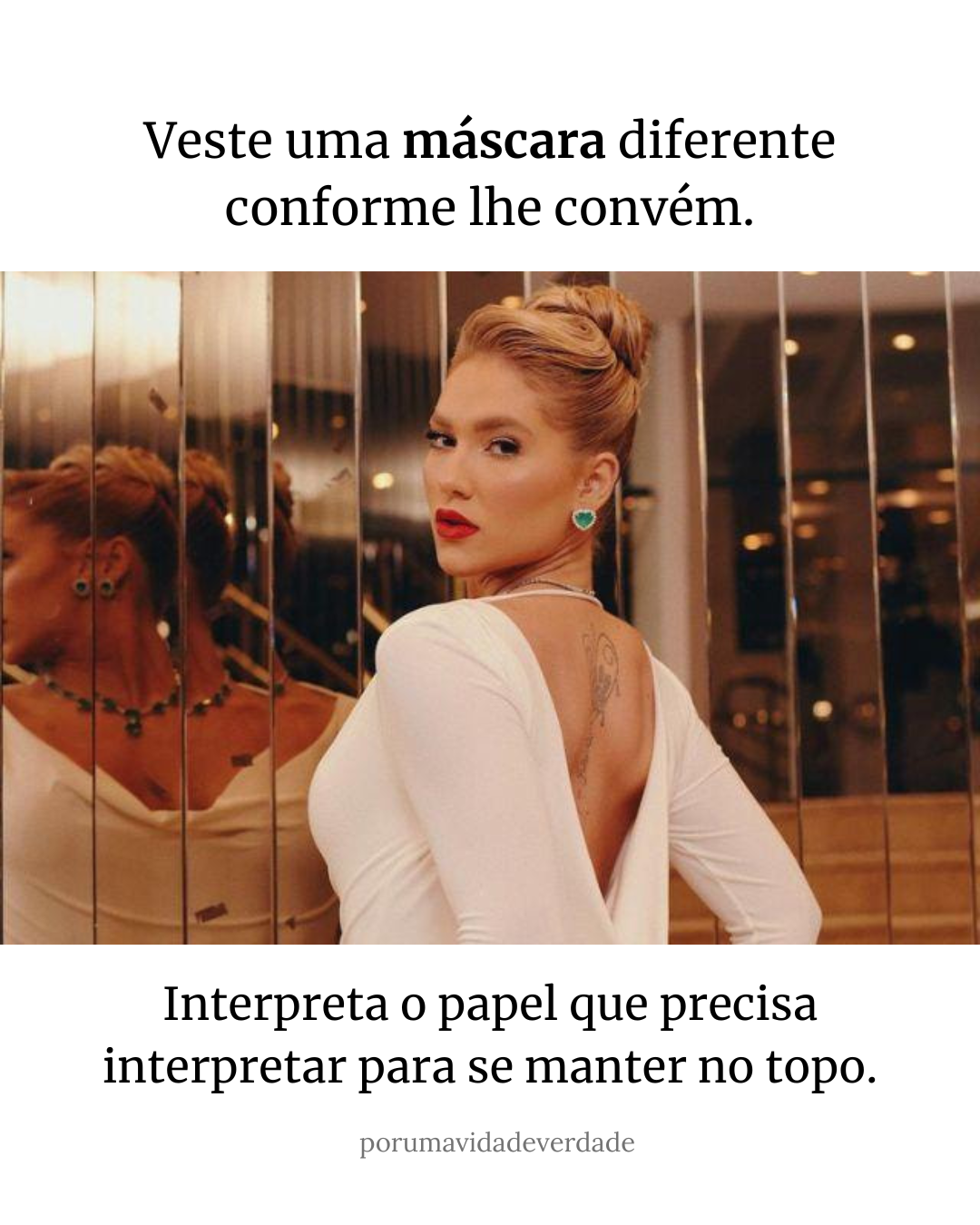 Pra manter seu posto de soberana cheia de súditos ela ostenta não apenas a vida perfeita, mas o corpo perfeito e o comportamento perfeito: a imagem da mulher idealizada por homens e mulheres. Seja a musa fitness, a empresária bem sucedida, a mãe de família, a esposa troféu ou a própria deusa Vênus… todas essas IMAGENS.
