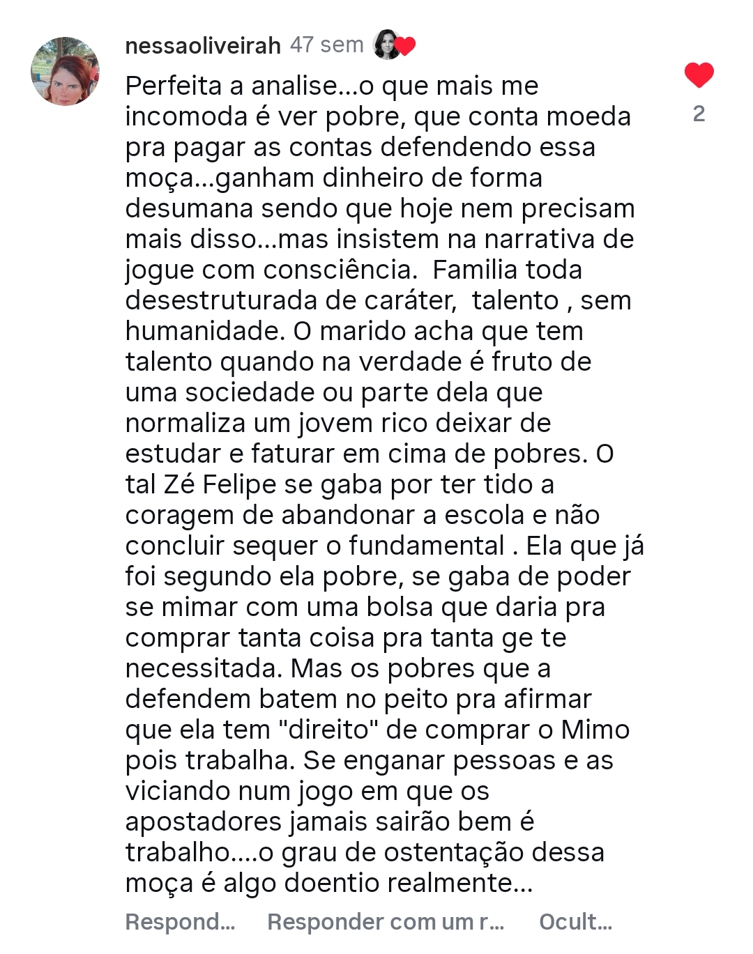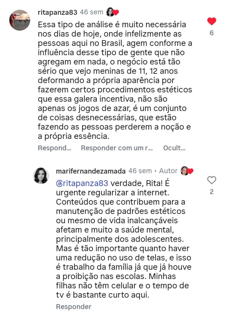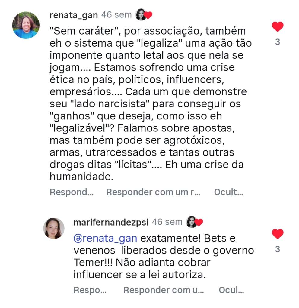 “Tudo que sei sobre fulana é contra a minha vontade”, é um desabafo comum nas redes sociais. Contudo, falar sobre a influência destrutiva dessas cidadãs – inclusive, da mais seguida nas redes sociais do país – se trata de interesse público, já que incentivam o uso de plataformas de jogos que viciam, principalmente, as pessoas mais pobres, mentindo sobre a possibilidade de enriquecimento, contribuem para a manutenção de ideais de beleza inatingíveis para a maioria das mulheres e ostentam um estilo de vida fútil.