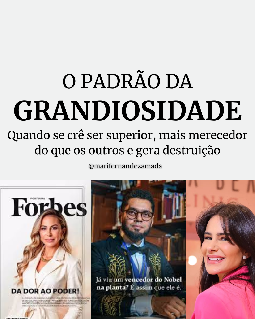 E não ver a grandiosidade como uma disfuncionalidade mas como um modelo a ser seguido é o que coloca sociopatas no poder, aumenta o alcance de influencers que “vencem na vida” independente da ética, torna o mundo mais violento do que a natureza pode suportar e fada a humanidade à autodestruição.