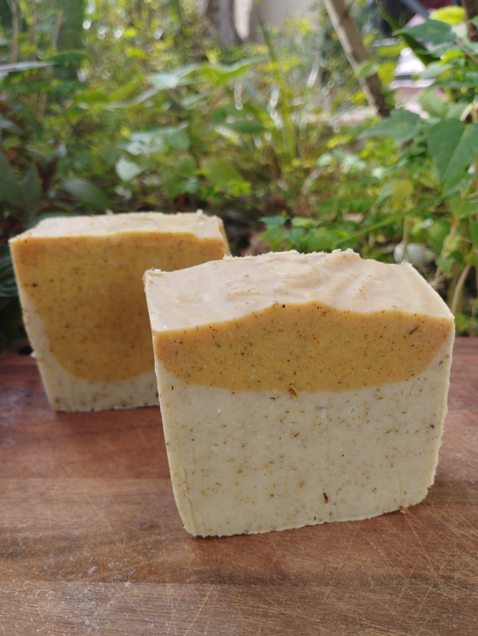 Sabão em barra de camomila, a base de manteiga de karité, argila amarela e óleo de coco.